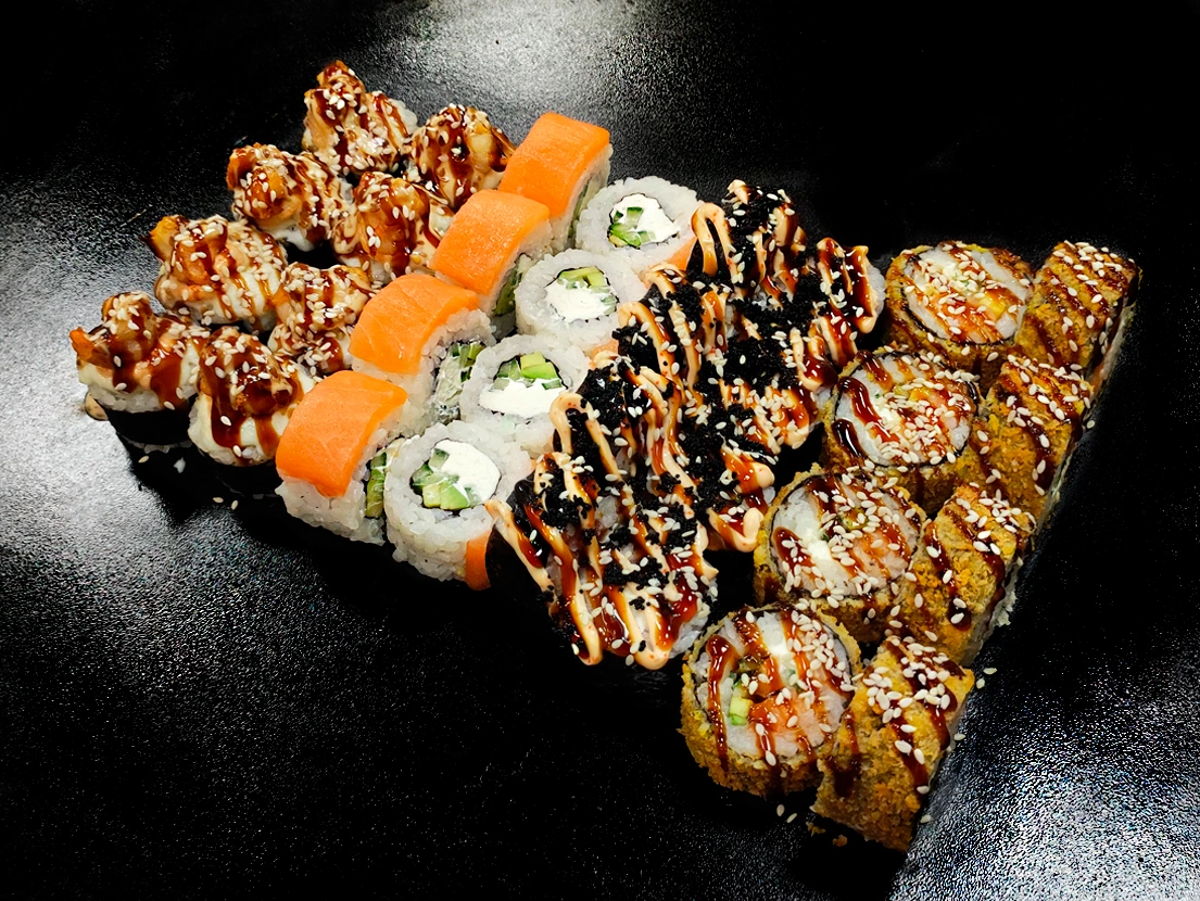 "Филадельфия лайт" - 8 шт "Тень Они" - 8 шт "Жареный с лососем" - 8 шт "Запеченный Кицунэ" - 8 шт