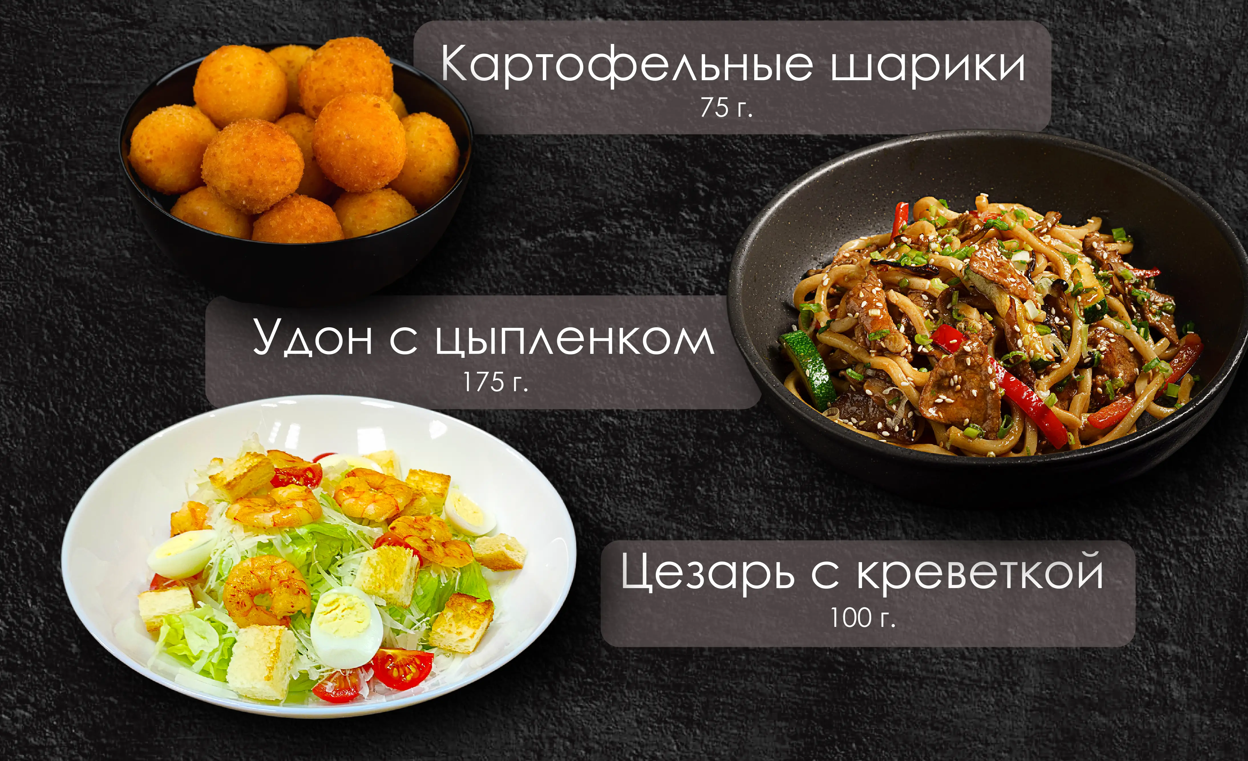 Удон с цыпленком, Цезарь с креветкой, Картофельные шарики